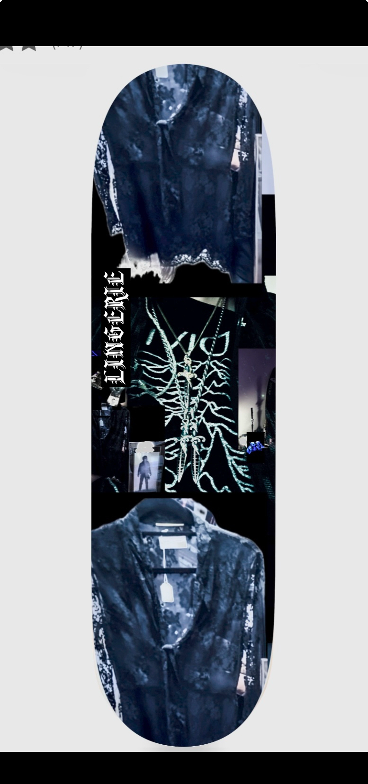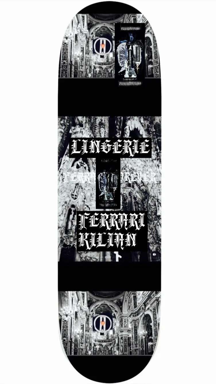 the name Lingerie was inspired in part by the title for the dj shadow song “what does your soul look like” and Ferrari’s penchant for subversive metaphor. Formally trained as a high artist, Ferrari ‘s intent is to merge the sacred and the everyday. the decks are therefor meant to hang as art, or to skate if you can afford it. Every deck is handmade to order, and custom grip can be discussed and added for an additional 101$. cost for each deck is $1111 us dollars. Many hours of work go into each deck design. for enquiries, email earthtoferrari@gmail.com.